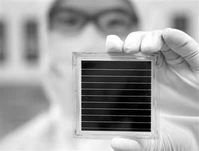 我國在鈣鈦礦電池研發領域取得重要突破。上海交通大學韓禮元教授團隊和蘇州黎元新能源科技有限公司合作研發,使面積36平方厘米鈣鈦礦太陽能組件的能量轉化效率突破了12%。圖為12月14日,技術人員在展示鈣鈦礦太陽能薄膜電池器件。新華社記者 陳飛攝