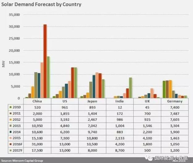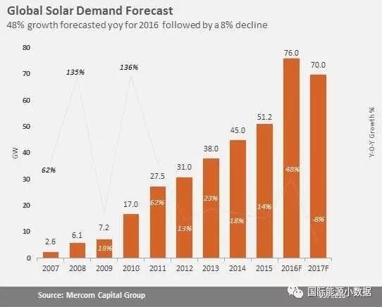 然而,Mercom Capital對2017年光伏新增裝機的規模不甚樂觀,與2016年相比可能下降8%(新增70GW),主要是因為受到光伏標桿價下調的影響,2017年中國的光伏新增裝機預計僅有17GW。