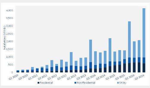 GTM Research副董事Cory Honeyman說:“受政府取消稅收抵免政策擔(dān)憂影響,2016年第三季度涌入大量公共事業(yè)規(guī)模項目儲備,這種趨勢將延續(xù)至2017上半年。”