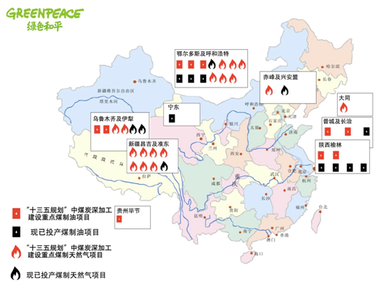 “規劃”列出了重點建設的煤化工項目及區域。根據綠色和平的統計,符合“規劃”中重點建設范圍和條件的煤制油、煤制氣項目產能總計約為2050萬噸和737.25億立方米,也遠遠超出了“規劃”所限定的1300 萬噸煤制油和170 億立方米煤制氣的總量。
