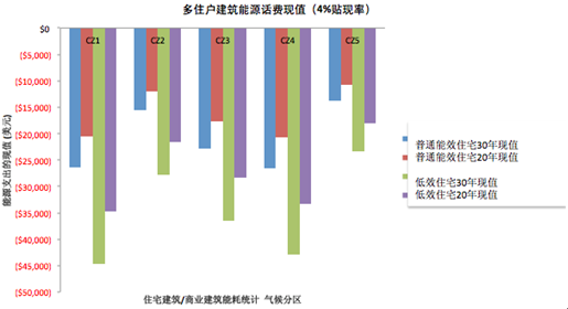 通過計(jì)算多住戶建筑平均用能支出和低效住宅建筑用能支出,落基山研究所以4%貼現(xiàn)率對比了多住戶建筑用能支出的現(xiàn)值。我們發(fā)現(xiàn),凈零排放改造最具經(jīng)濟(jì)吸引力的區(qū)域是第1氣候區(qū)域,第4區(qū)緊隨其后。