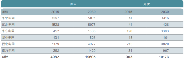 表:分區域風電與光伏能源替代(2015/2030)(單位:萬噸標準煤)