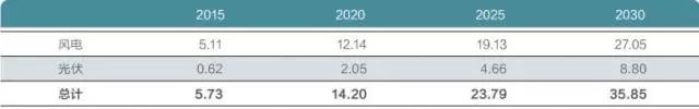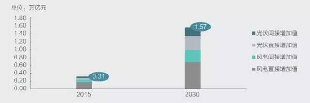 2015年,風光發電拉動投資約3999億元;報告預測,到2030年,投資數額將增長至4954億元,風光發電累計拉動投資約5.4萬億元,其中風電與光伏發電投資額相當。