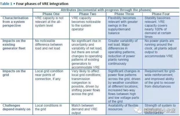 國(guó)際能源署發(fā)布報(bào)告Getting Wind and Sun onto the Grid,按照電網(wǎng)吸納間歇性可再生能源(主要是風(fēng)電、光伏)的比例劃分了4個(gè)階段: