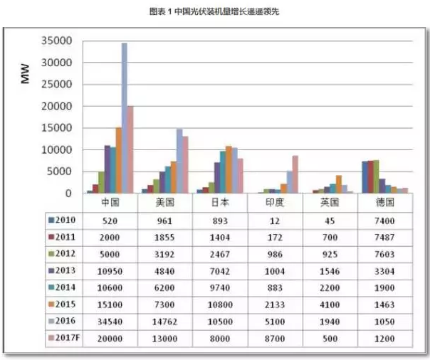 (一)中國2016年中國光伏發電新增裝機容量34.54GW,累計裝機容量77.42GW,新增和累計裝機容量均為全球第一。其中,地面電站30.3GW,分布式電站4.24GW,分布式電站同比增長200%。