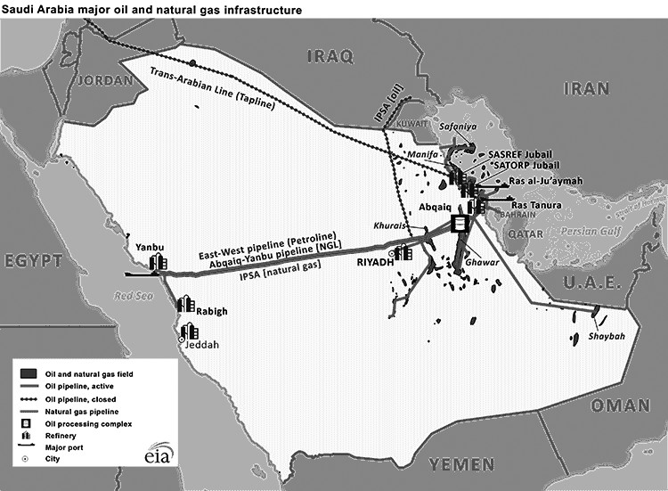 除此之外,沙特阿拉伯國內(nèi)通過輸油管道連接油田與港口,并貫通東西。沙特阿拉伯目前擁有兩條主要的輸油管道項目,一條是連接波斯灣到紅海的East-West管道項目,又稱Petroline,此管道全長746英里,用以連接Abqaiq原油處理廠與紅海出口港。Petroline擁有兩條輸油管道,其中一條56英尺直徑的管道擁有約300萬桶/天的輸油能力,主要用于輸送原油,另一條48英尺直徑的管道擁有約180萬桶/天的輸油能力,曾經(jīng)主要用于輸送液化天然氣,但在近期已被政府用于輸送原油。此管道項目使得沙特阿拉伯原油有機(jī)會從紅海出口,擺脫對霍爾木茲海峽的依賴。另一條管道項目主要是連接Abqaiq與Yanbu的液化天然氣管道項目,主要用于輸送液化天然氣,輸油能力約為29萬桶/天。此外,沙特阿拉伯還擁有連接?xùn)|部省份Dhahran與首都Riyadh的輸油管道以及連接Riyadh與北部省份Qassim的輸油管道。