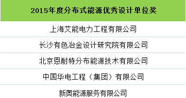 為肯定和表彰本年度在中國分布式能源領域做出突出貢獻的企業與個人,由中國能源網發起、會議主辦方大力支持的“2015(第十一屆)分布式能源國際論壇獎項評選”活動結果在會議期間正式公布。獎項分為:2015年度中國分布式能源優秀項目獎、優秀設計單位獎、杰出貢獻人物獎。