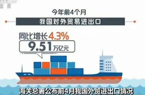 今年前4個(gè)月我國(guó)外貿(mào)進(jìn)出口增長(zhǎng)4.3%據(jù)海關(guān)統(tǒng)計(jì),今年前4個(gè)月,我國(guó)貨物貿(mào)易進(jìn)出口總值9.51萬(wàn)億元人民幣,比去年同期(下同)增長(zhǎng)4.3%。其中,出口5.06萬(wàn)億元,增長(zhǎng)5.7%;進(jìn)口4.45萬(wàn)億元,增長(zhǎng)2.9%;貿(mào)易順差6181.7億元,擴(kuò)大31.8%。 [詳細(xì)]